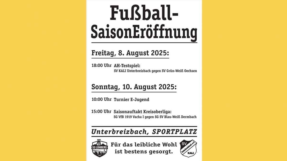 Am Sonntag trifft die 1. Mannschaft der SG Lohberg am ersten Spieltag der KOL auf Blau-Weiß Dermbach. Anstoß ist um 15 Uhr in Unterbreizbach.